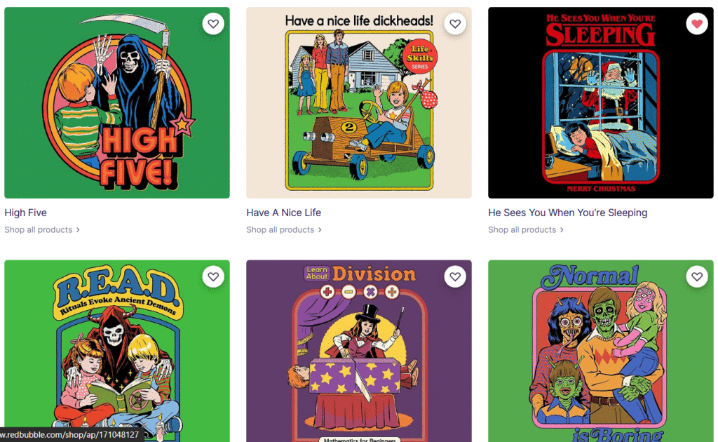 Ademais, nichar sua arte pode ser um divisor de águas. Por exemplo: em vez de desenhar “gatos”, crie ilustrações sobre “gatos bruxos”, “gatos do espaço” ou “gatos que amam café”. Um outro exemplo é a loja do Steve Rhodes no Redbubble, esse artista tem um estilo vintage nostálgico com humor negro em toda a sua coleção, trazendo uma identidade única.